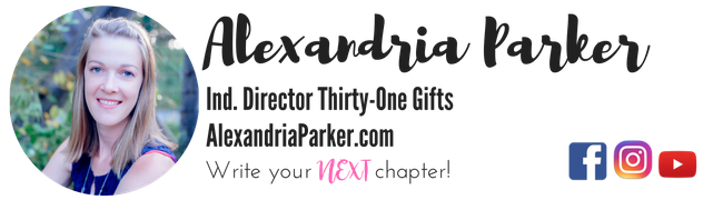 This marketing material was created by Alexandria Parker, an Independent Sales Consultant for Thirty- One Gifts LLC, who is solely responsible for its content. Thirty-One Gifts LLC does not endorse and is not responsible for the content of this marketing material.